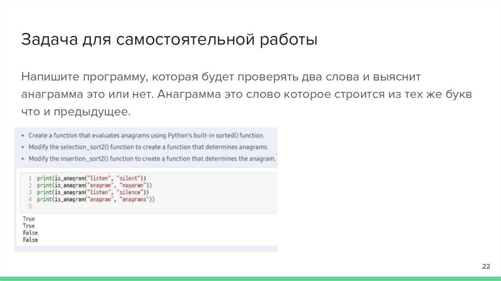 Задача для самостоятельной работыНапишите программу, которая будет проверять два слова и выяснит