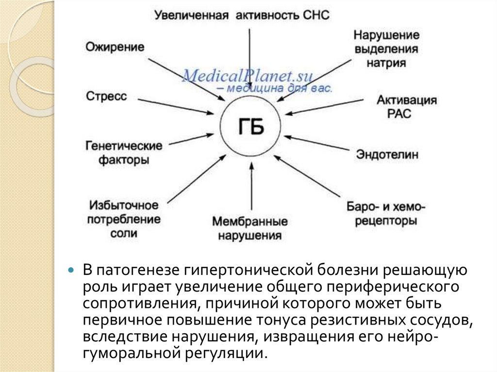 В патогенезе гипертонической болезни решающуюроль играет увеличение общего периферического