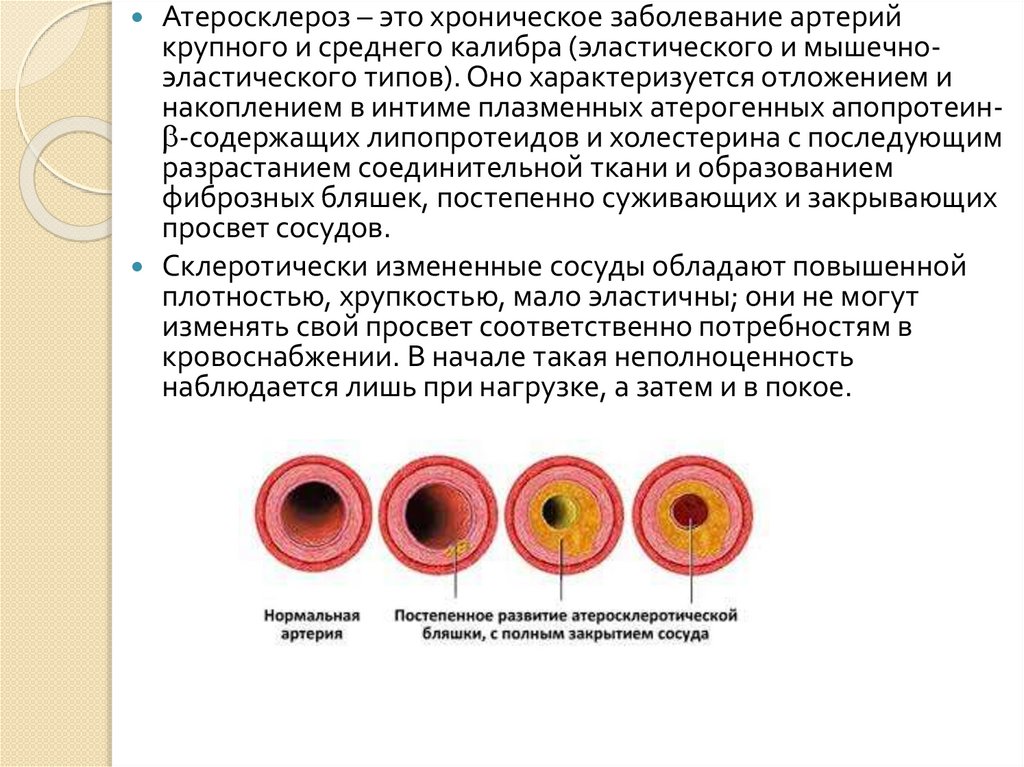 Атеросклероз – это хроническое заболевание артерийкрупного и среднего калибра (эластического и мышечноэластического типов). Оно характеризуется отложением и