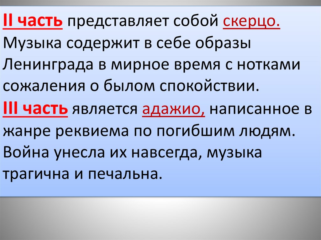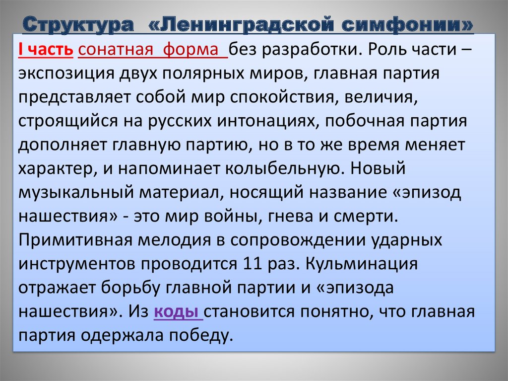 Структура «Ленинградской симфонии»I часть сонатная форма без разработки. Роль части –