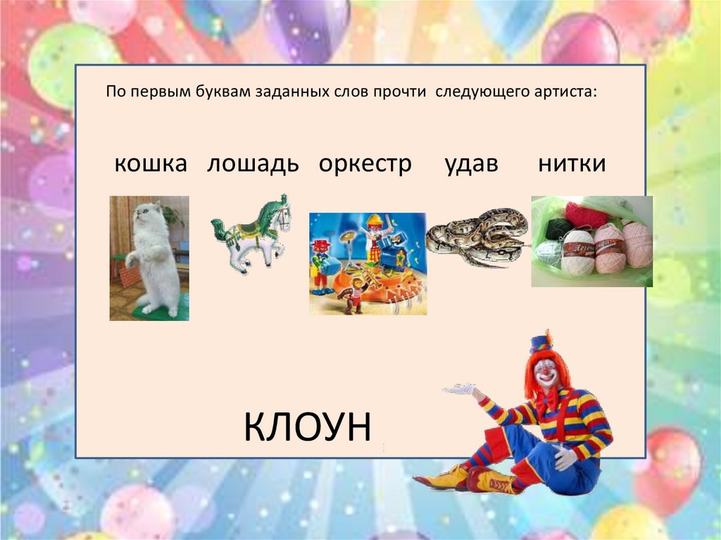 По первым буквам заданных слов прочти следующего артиста:кошка лошадь оркестр