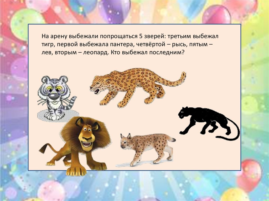 На арену выбежали попрощаться 5 зверей: третьим выбежалтигр, первой выбежала пантера, четвёртой – рысь, пятым –