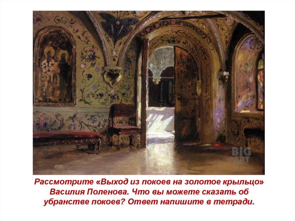Рассмотрите «Выход из покоев на золотое крыльцо»Василия Поленова. Что вы можете сказать об