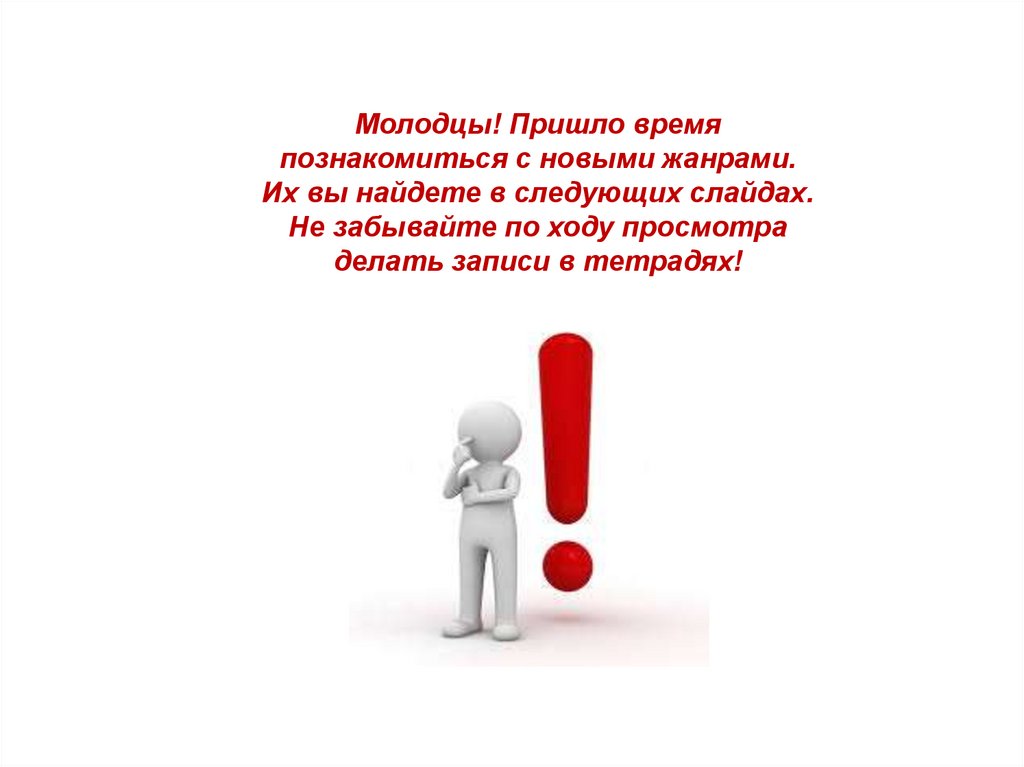 Молодцы! Пришло времяпознакомиться с новыми жанрами.