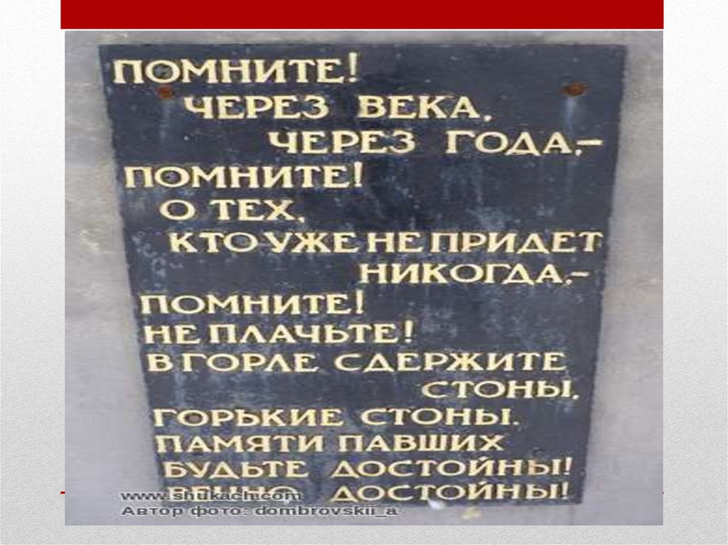 Помните! Через века, через года, - помните! О тех, кто уже не придет никогда, - помните! Не плачьте! В горле