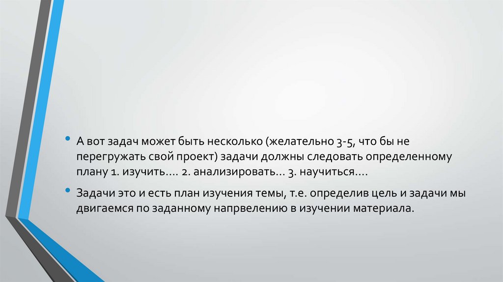 • А вот задач может быть несколько (желательно 3-5, что бы неперегружать свой проект) задачи должны следовать определенному