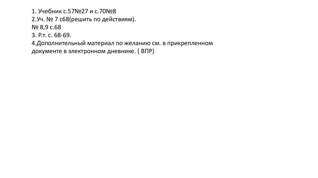 1. Учебник с.57№27 и с.70№82.Уч. № 7 с68(решить по действиям).