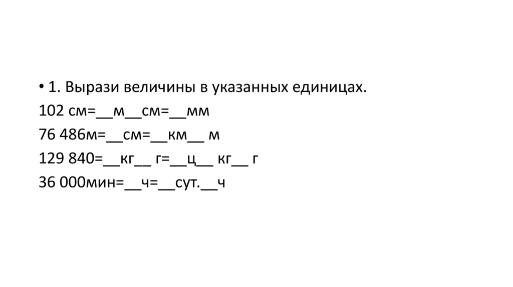 • 1. Вырази величины в указанных единицах.102 см=__м__см=__мм