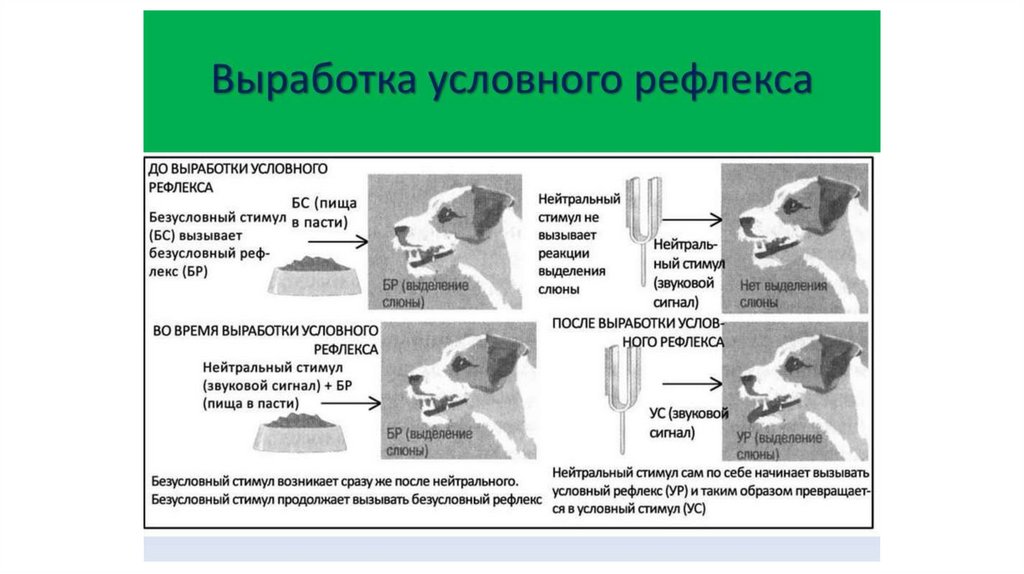 вызывать безусловную реакцию. Теперь только лишь звука звонка достаточно, чтобы у собаки потекла слюна. Этот