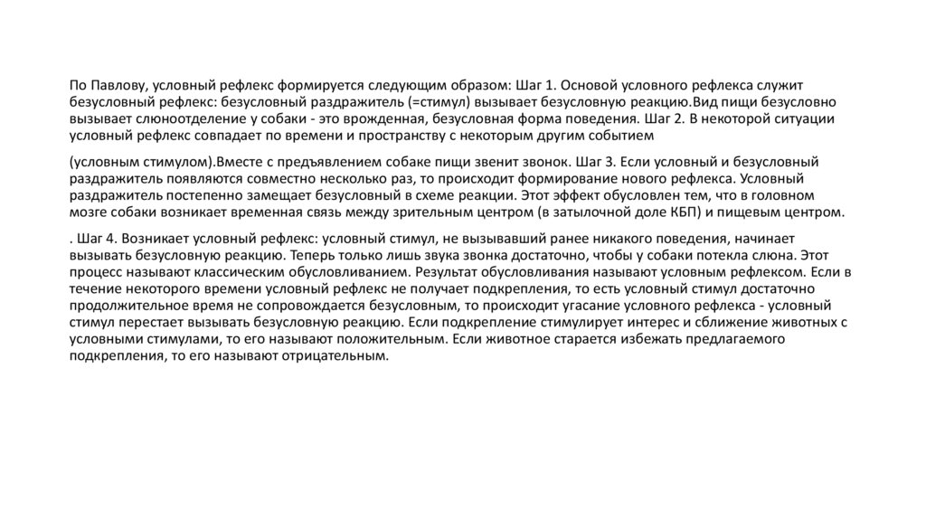 По Павлову, условный рефлекс формируется следующим образом: Шаг 1. Основой условного рефлекса служитбезусловный рефлекс: безусловный раздражитель (=стимул) вызывает безусловную реакцию.Вид пищи безусловно
