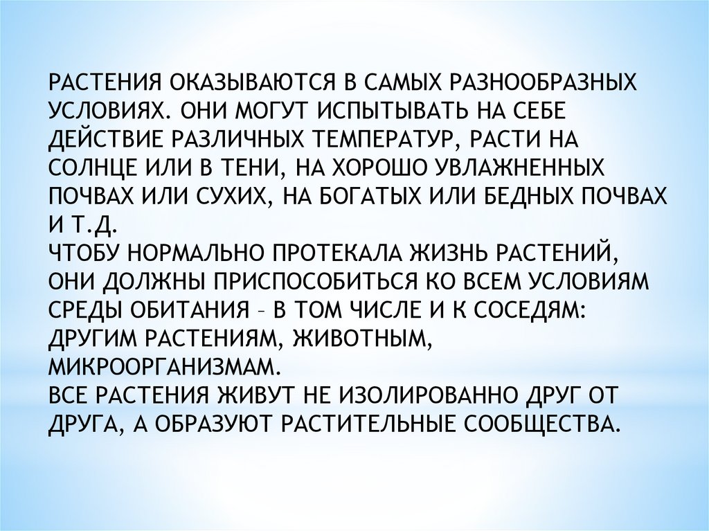 РАСТЕНИЯ ОКАЗЫВАЮТСЯ В САМЫХ РАЗНООБРАЗНЫХУСЛОВИЯХ. ОНИ МОГУТ ИСПЫТЫВАТЬ НА СЕБЕ
