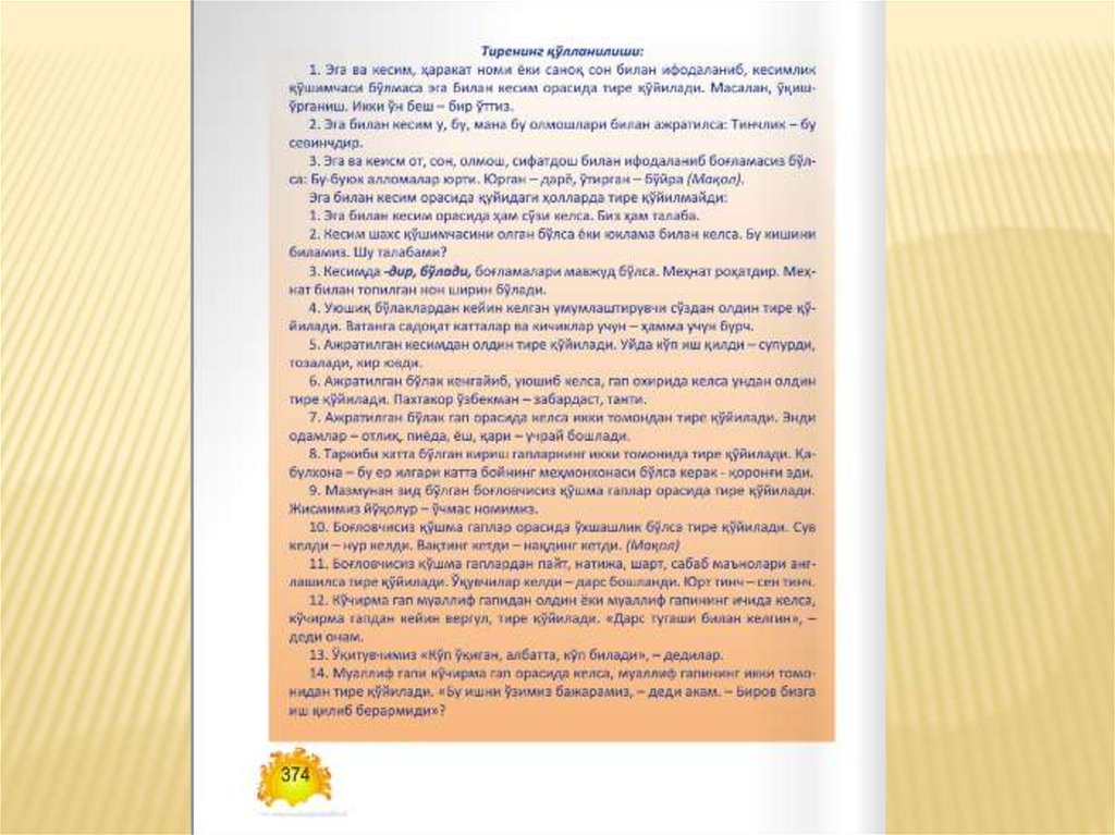 Матнда берилган чизиқча ва тиренингқўлланилишига эътиборни қаратинг.