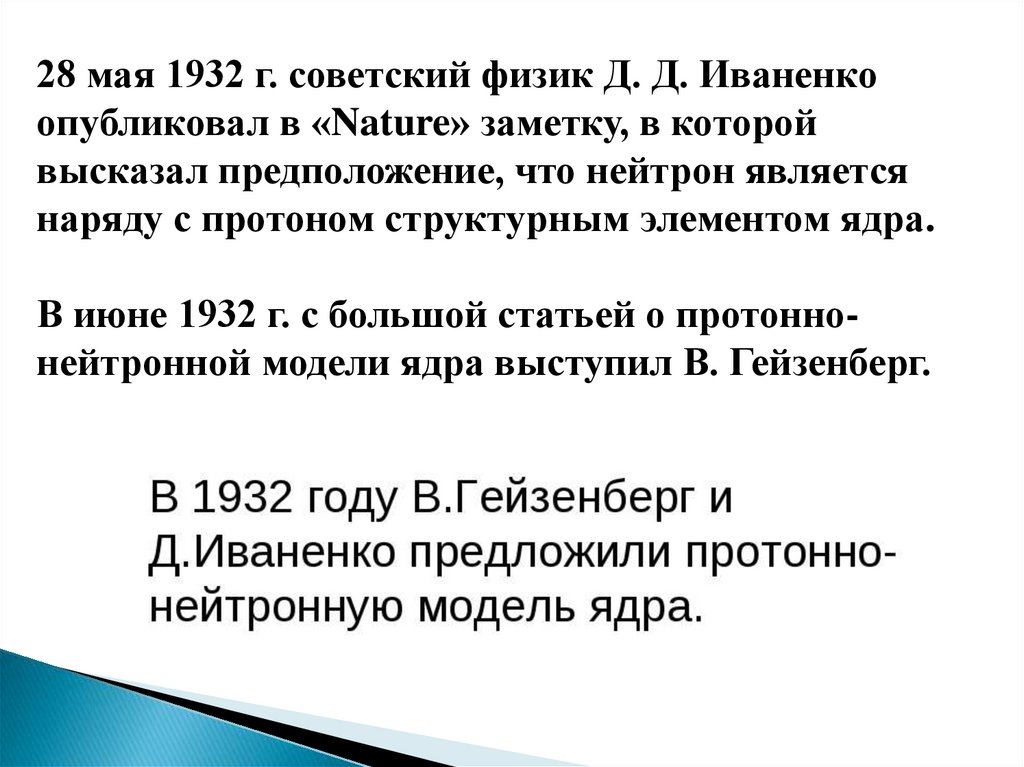 28 мая 1932 г. советский физик Д. Д. Иваненкоопубликовал в «Nature» заметку, в которой