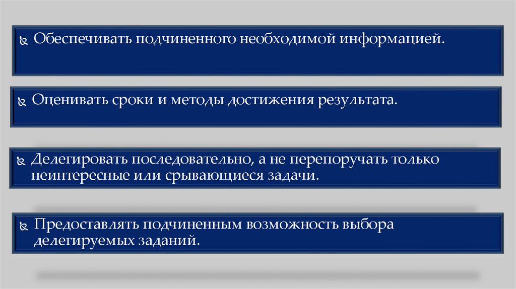 Обеспечивать подчиненного необходимой информацией.Оценивать сроки и методы достижения результата.