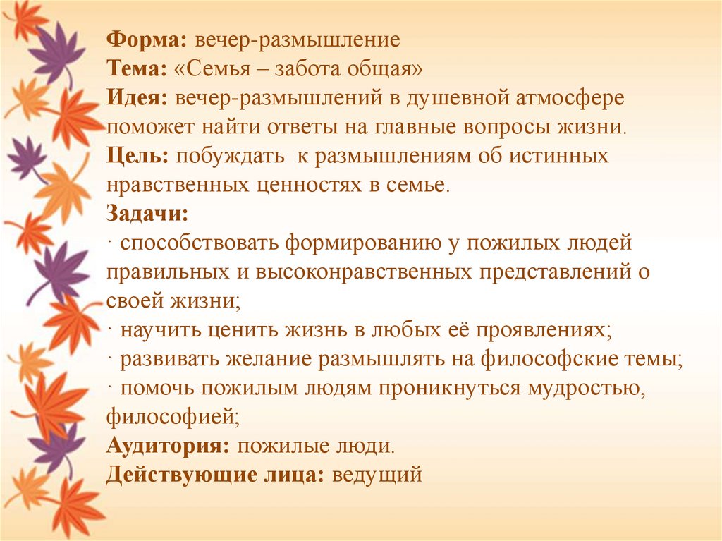 Форма: вечер-размышлениеТема: «Семья – забота общая»
