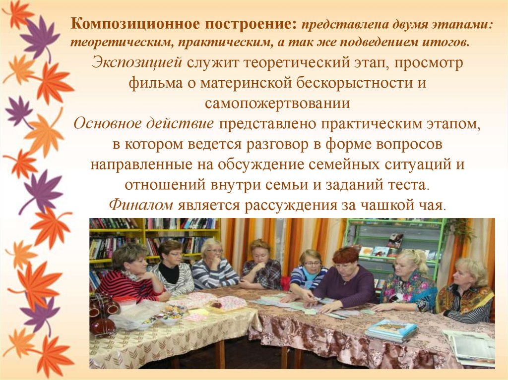 Композиционное построение: представлена двумя этапами:теоретическим, практическим, а так же подведением итогов.