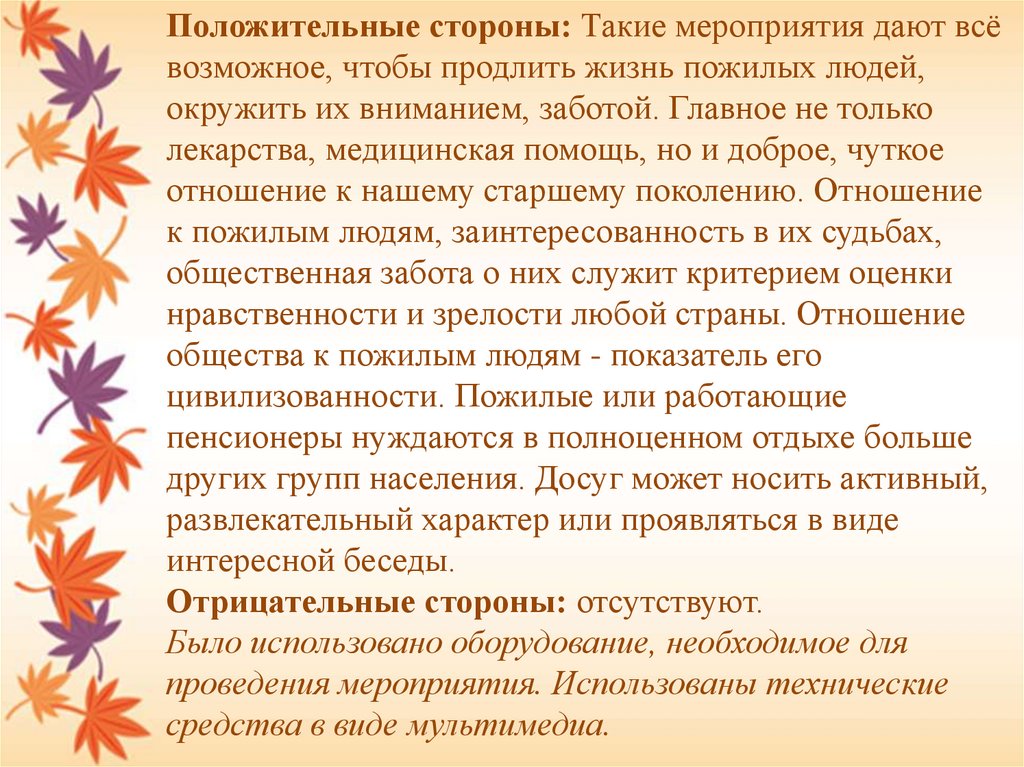 Положительные стороны: Такие мероприятия дают всёвозможное, чтобы продлить жизнь пожилых людей,