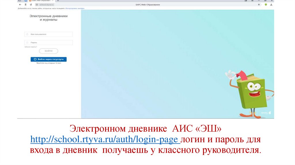 Электронном дневнике АИС «ЭШ»http://school.rtyva.ru/auth/login-page логин и пароль для