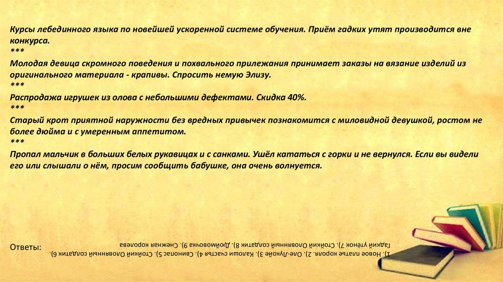 Курсы лебединного языка по новейшей ускоренной системе обучения. Приём гадких утят производится внеконкурса.