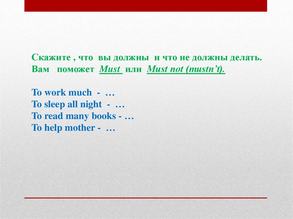 Скажите , что вы должны и что не должны делать.Вам поможет Must или Must not (mustn’t).