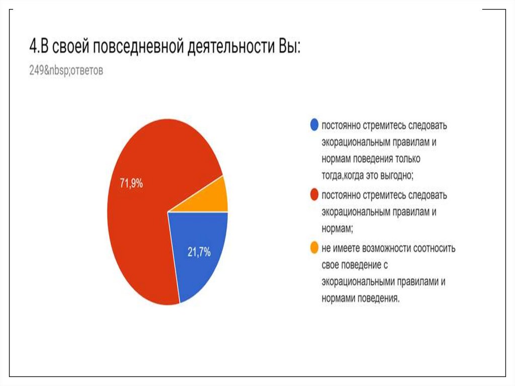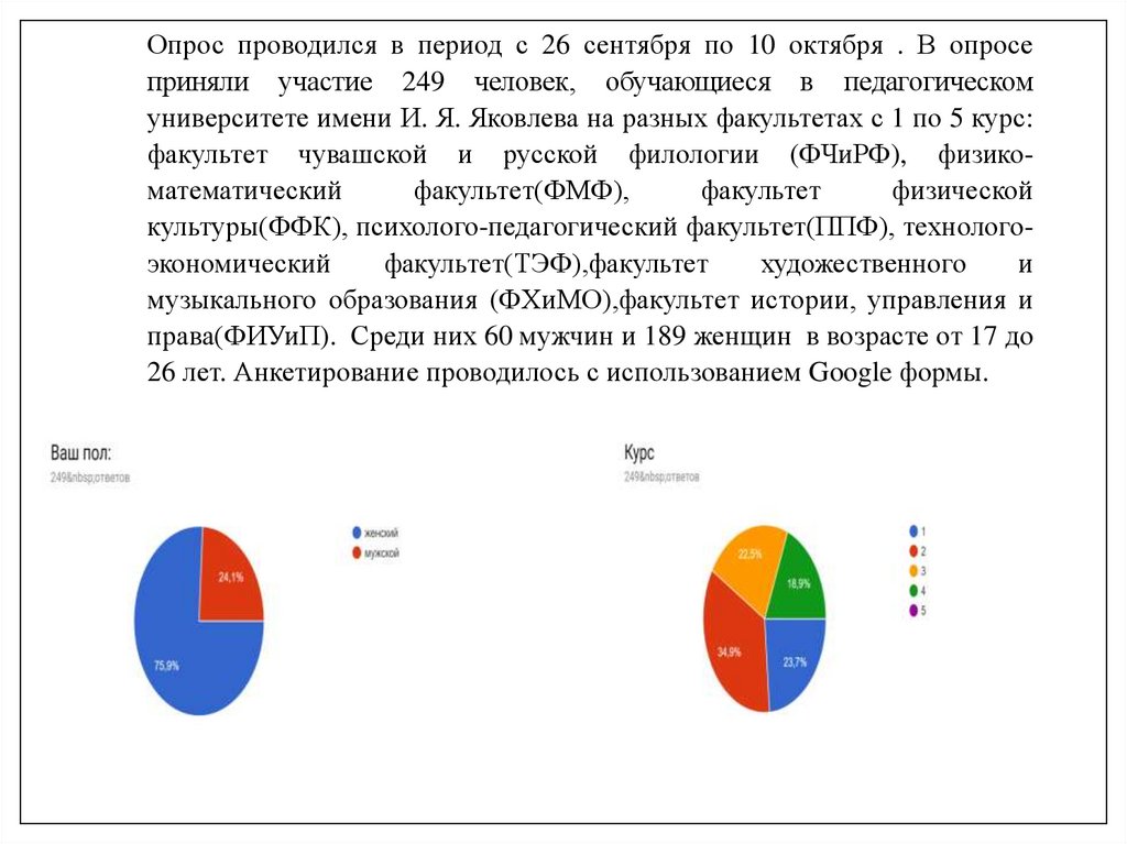 Опрос проводился в период с 26 сентября по 10 октября . В опросеприняли участие 249 человек, обучающиеся в педагогическом