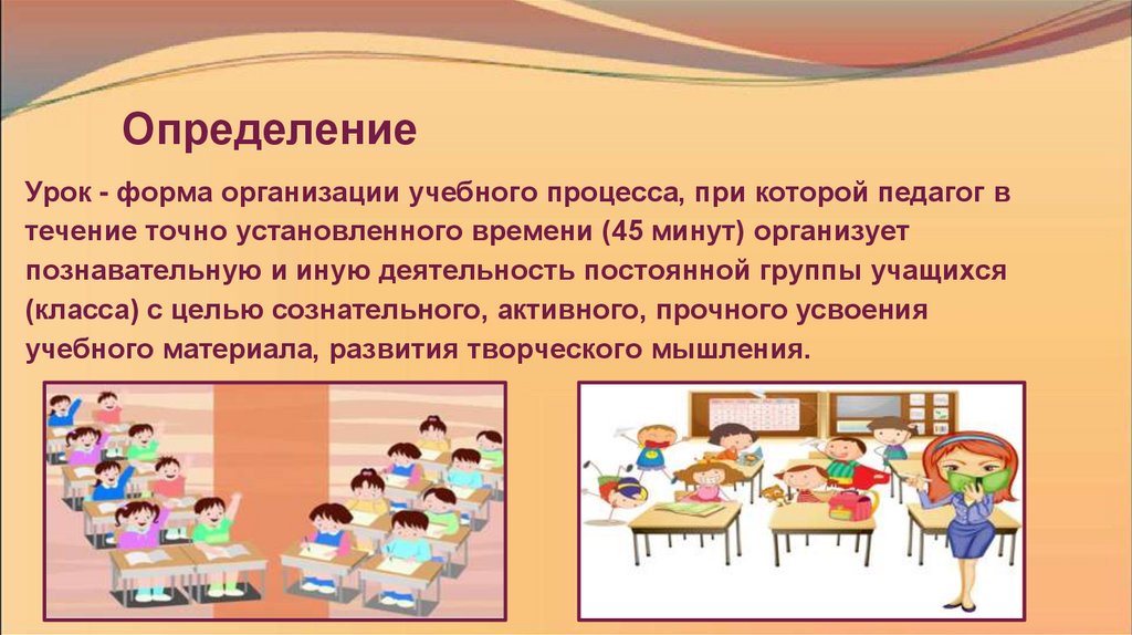 ОпределениеУрок - форма организации учебного процесса, при которой педагог в