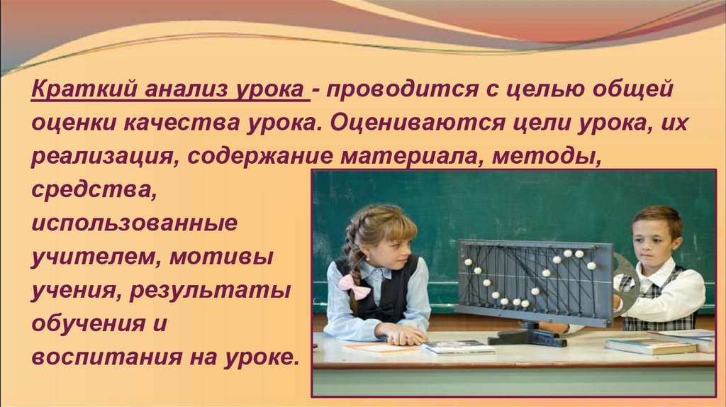 Краткий анализ урока - проводится с целью общейоценки качества урока. Оцениваются цели урока, их