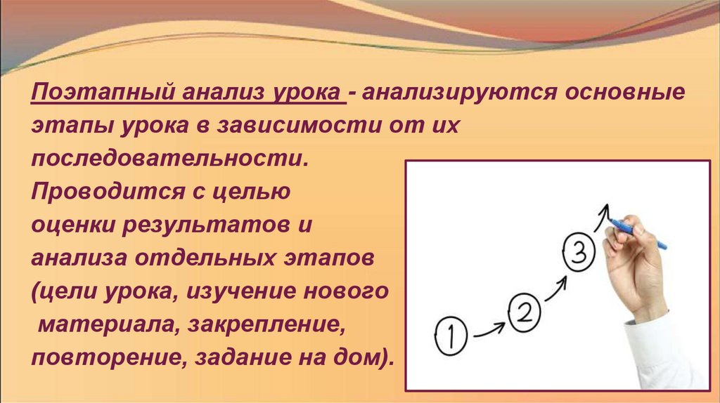 Поэтапный анализ урока - анализируются основныеэтапы урока в зависимости от их