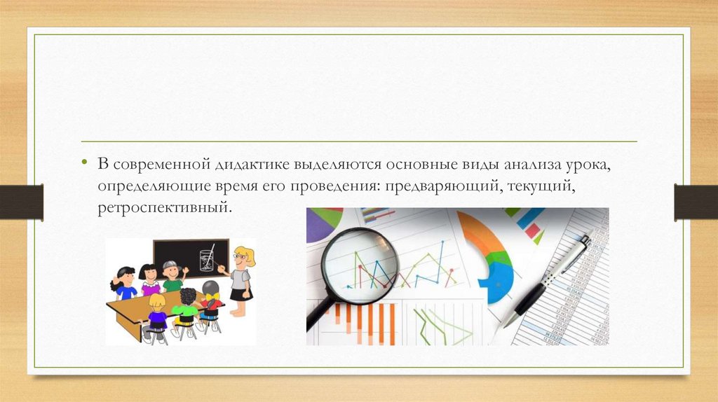 • В современной дидактике выделяются основные виды анализа урока,определяющие время его проведения: предваряющий, текущий,