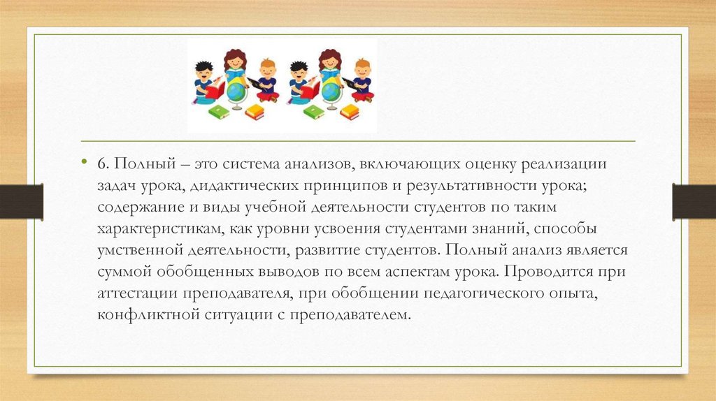 • 6. Полный – это система анализов, включающих оценку реализациизадач урока, дидактических принципов и результативности урока;