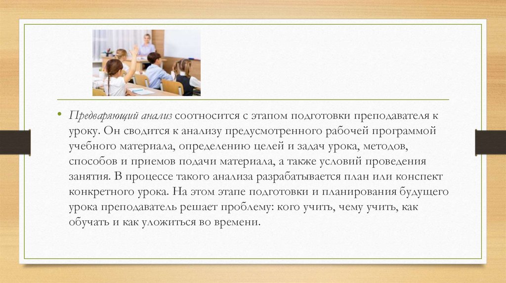 • Предваряющий анализ соотносится с этапом подготовки преподавателя куроку. Он сводится к анализу предусмотренного рабочей программой