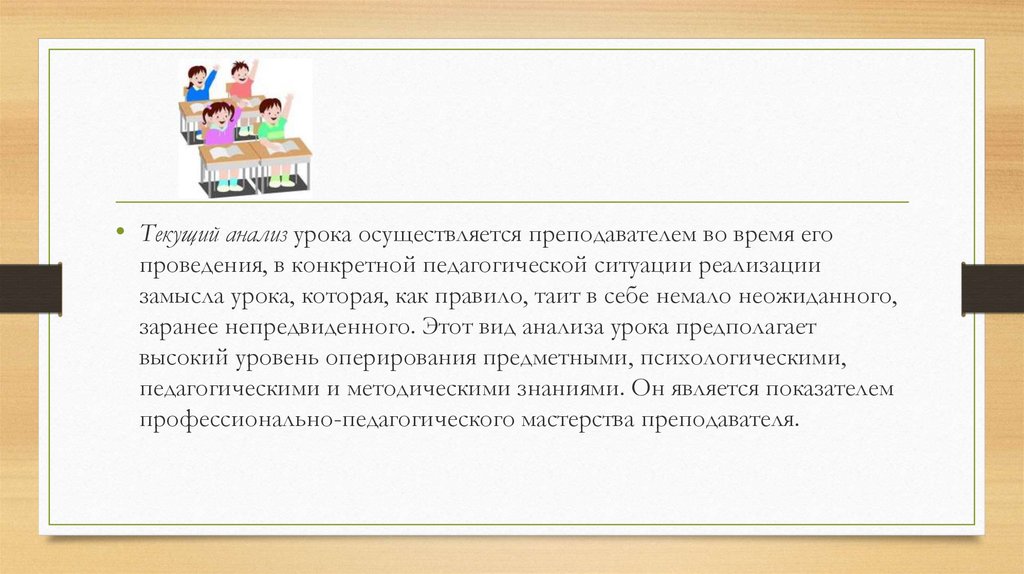 • Текущий анализ урока осуществляется преподавателем во время егопроведения, в конкретной педагогической ситуации реализации