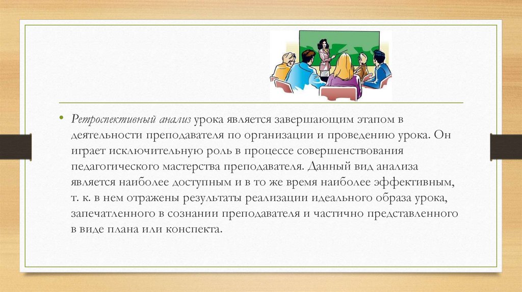 • Ретроспективный анализ урока является завершающим этапом вдеятельности преподавателя по организации и проведению урока. Он
