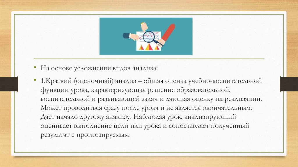 • На основе усложнения видов анализа:• 1.Краткий (оценочный) анализ – общая оценка учебно-воспитательной