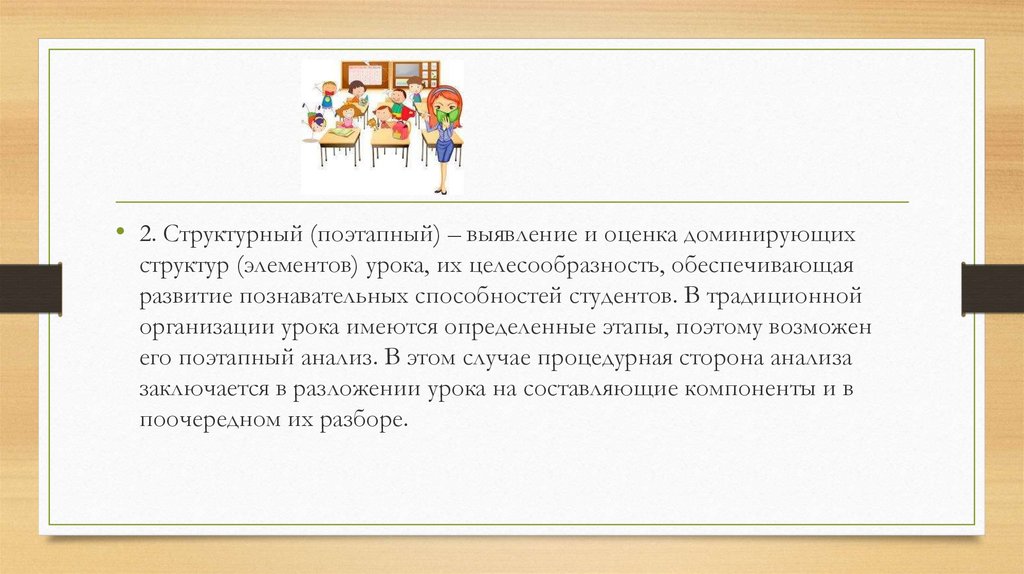 • 2. Структурный (поэтапный) – выявление и оценка доминирующихструктур (элементов) урока, их целесообразность, обеспечивающая
