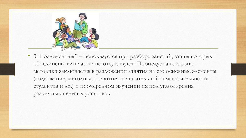 • 3. Поэлементный – используется при разборе занятий, этапы которыхобъединены или частично отсутствуют. Процедурная сторона