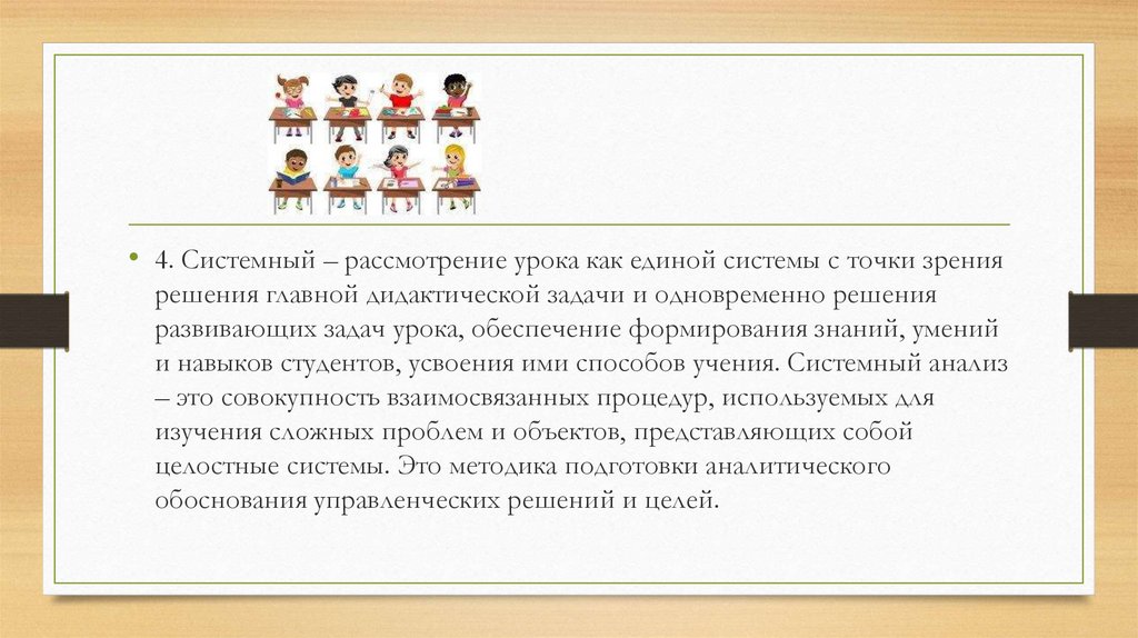 • 4. Системный – рассмотрение урока как единой системы с точки зрениярешения главной дидактической задачи и одновременно решения
