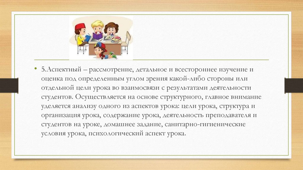 • 5.Аспектный – рассмотрение, детальное и всестороннее изучение иоценка под определенным углом зрения какой-либо стороны или