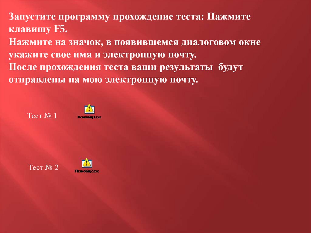Запустите программу прохождение теста: Нажмитеклавишу F5.