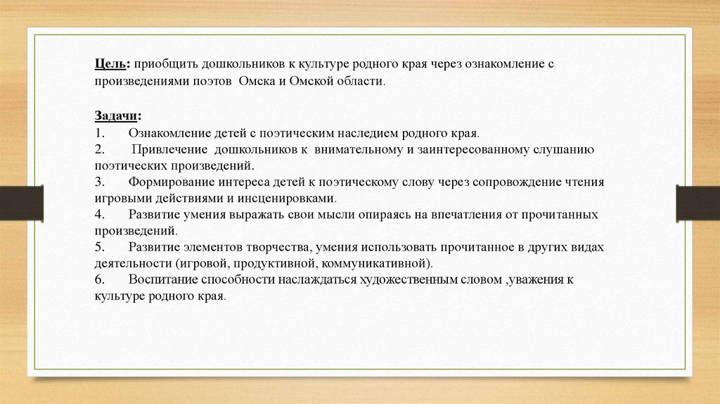 Цель: приобщить дошкольников к культуре родного края через ознакомление спроизведениями поэтов Омска и Омской области.
