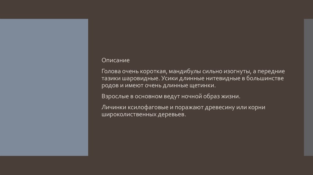 ОписаниеГолова очень короткая, мандибулы сильно изогнуты, а передние
