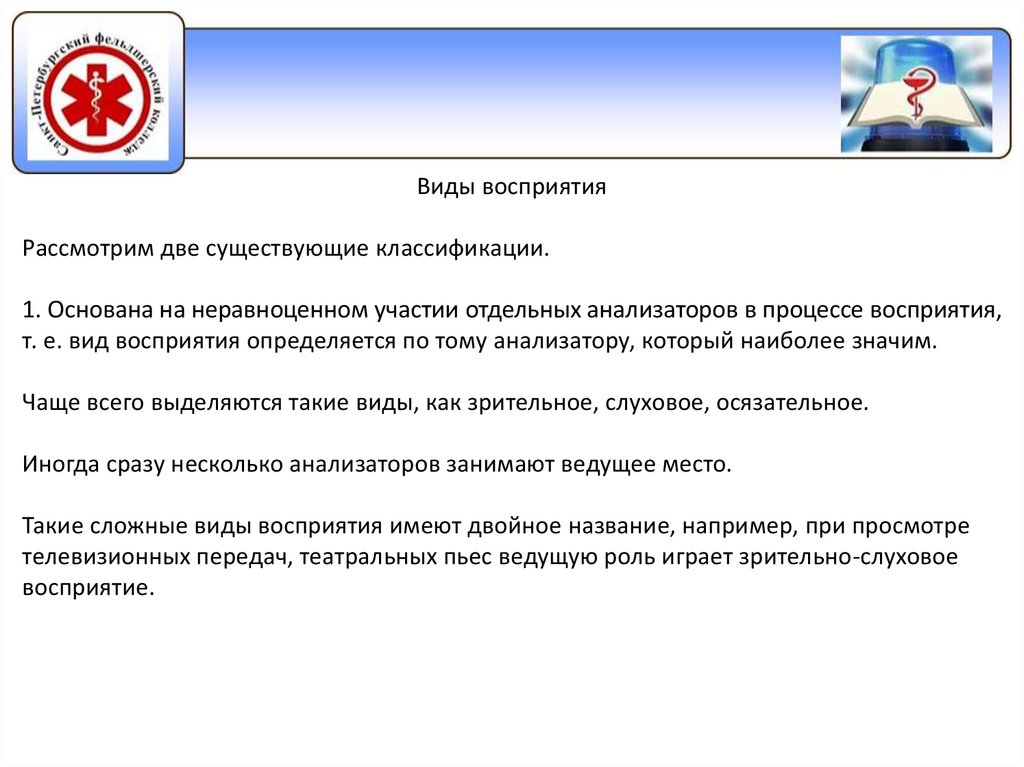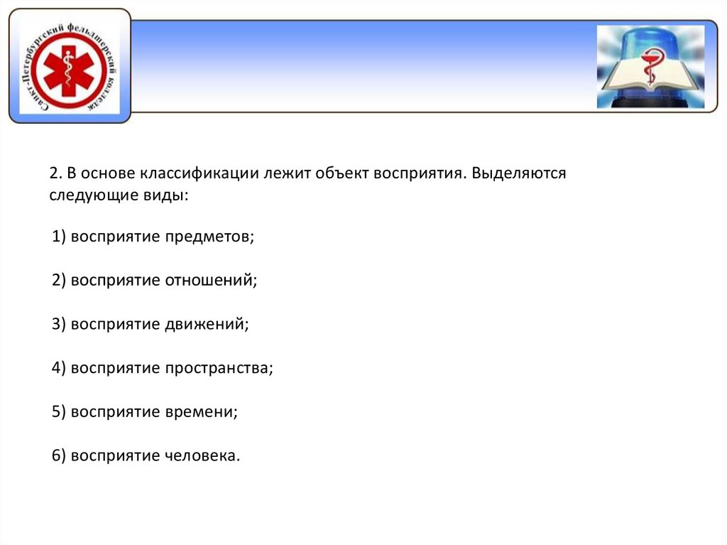2. В основе классификации лежит объект восприятия. Выделяютсяследующие виды: