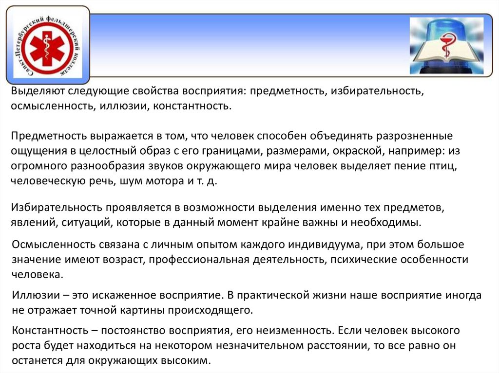Выделяют следующие свойства восприятия: предметность, избирательность,осмысленность, иллюзии, константность.