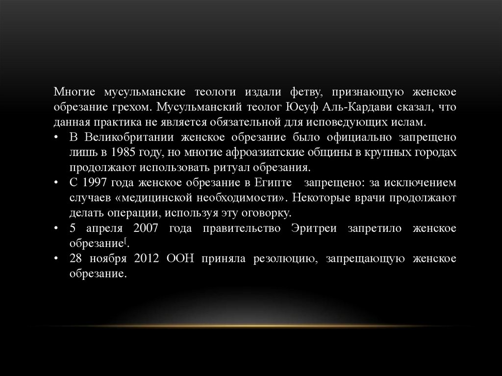 Многие мусульманские теологи издали фетву, признающую женскоеобрезание грехом. Мусульманский теолог Юсуф Аль-Кардави сказал, что