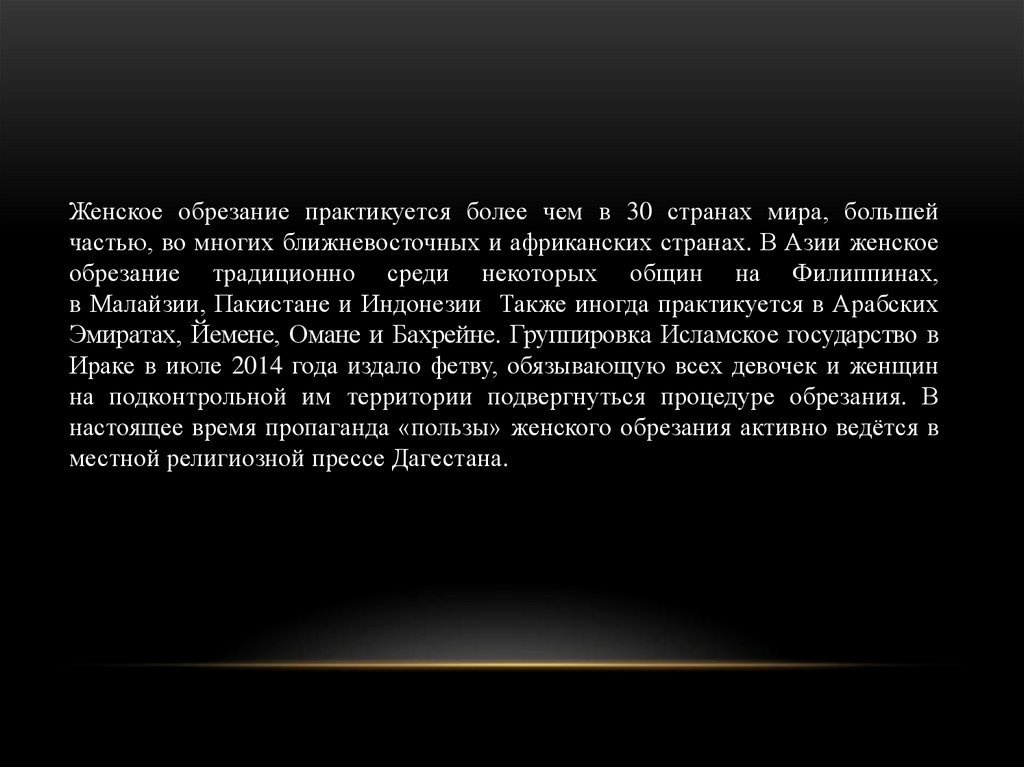 Женское обрезание практикуется более чем в 30 странах мира, большейчастью, во многих ближневосточных и африканских странах. В Азии женское