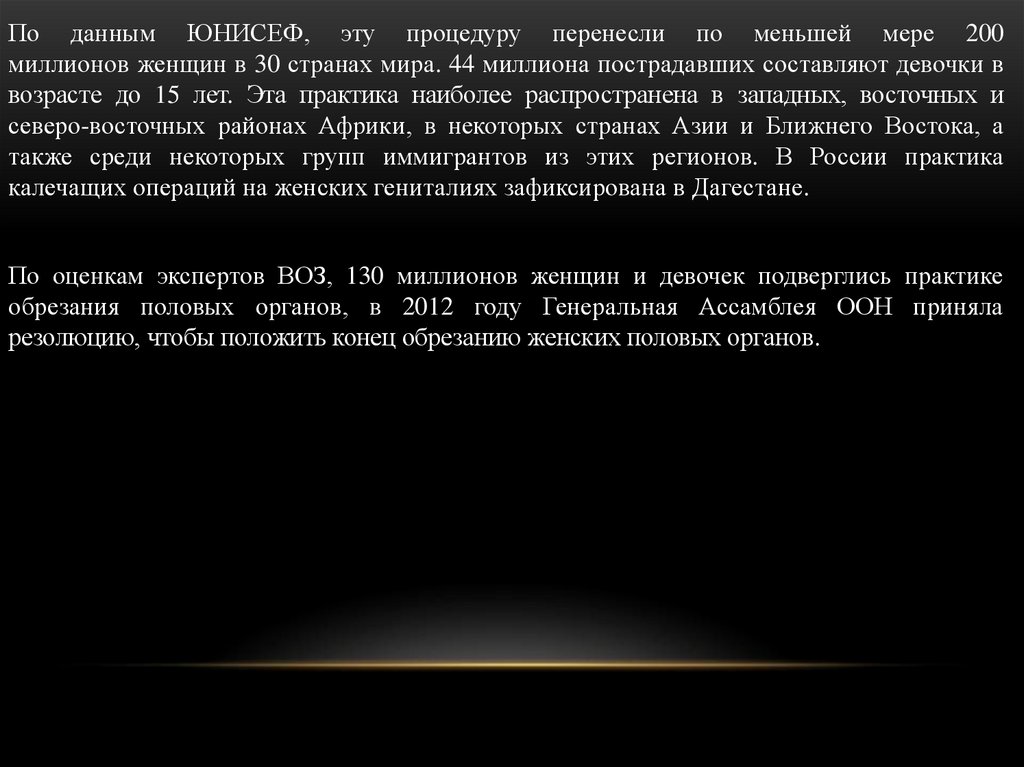По данным ЮНИСЕФ, эту процедуру перенесли по меньшей мере 200миллионов женщин в 30 странах мира. 44 миллиона пострадавших составляют девочки в