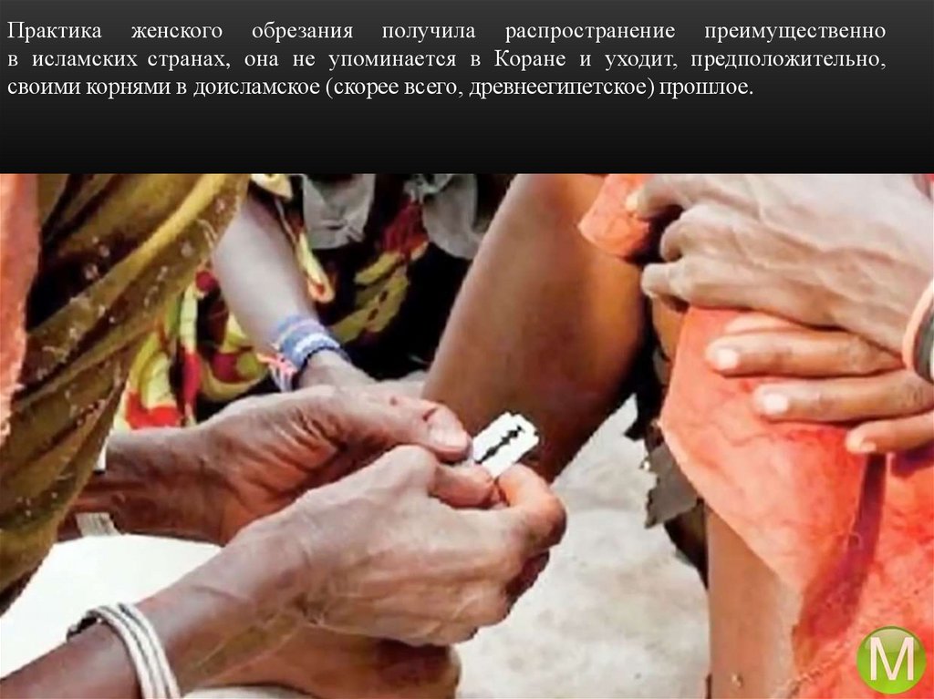 Практика женского обрезания получила распространение преимущественнов исламских странах, она не упоминается в Коране и уходит, предположительно,