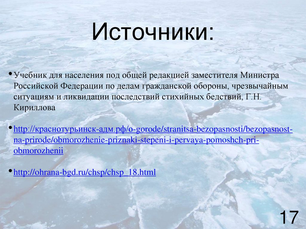 • http://краснотурьинск-адм.рф/o-gorode/stranitsa-bezopasnosti/bezopasnostna-prirode/obmorozhenie-priznaki-stepeni-i-pervaya-pomoshch-priobmorozhenii