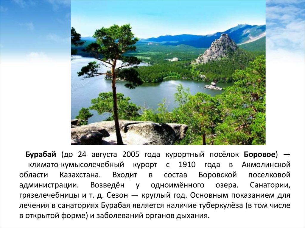 Бурабай (до 24 августа 2005 года курортный посёлок Боровое) —климато-кумысолечебный курорт с 1910 года в Акмолинской