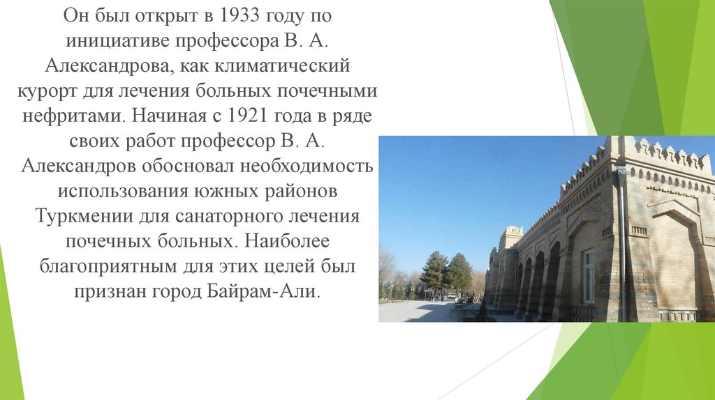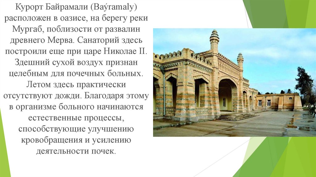 Курорт Байрамали (Baýramaly)расположен в оазисе, на берегу реки